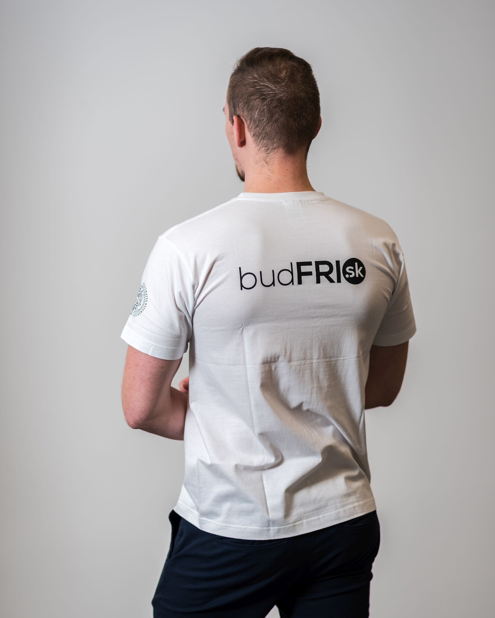 Elegantné biele pánske tričko s nápisom IaST, určené študentom a absolventom študíjneho programu Informačné a sieťové technológie